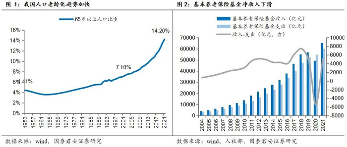 我国人口老龄化趋势加快,长期来看基本养老保险基金缺口较大。 2021 年中国65岁以上老年人口达到了 2.0 亿,占全国总人口的14.2%,突破国际通用深度老龄化指标14%。同时,2001-2021的20年间老年人口占比提升了7.1pt,远高于1953-2001近50年的增长2.7pt,人口老龄化趋势加快。然而伴随着人口老龄化的加深,基本养老保险基金累计结余增长缓慢,2019年以来出现基金净收入下滑乃至为负的情况,长期来看将不足以应对加速发展的老龄化趋势。根据《中国养老金精算报告 2019-2050》测算,减轻企业缴费费率至16%的情况下,全国城镇企业职工基本养老保险基金累计结余将于 2027 年达到顶点7.0万亿元,到 2035 年耗尽。
