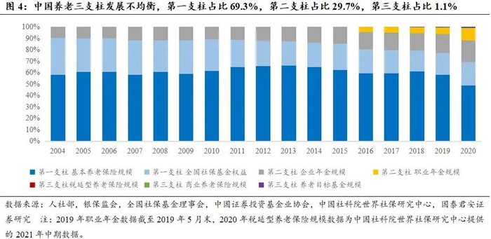 个人养老金政策推出的核心目的是缓解一二支柱压力:我国的养老三支柱体系发展不均衡,以第一支柱为主导,第二支柱发展有限,第三支柱贡献微乎其微。截至2020年末,第一支柱规模近8.27万亿元,占比69.3%,第二支柱规模近3.54万亿元,占比29.7%,第三支柱规模近1,310亿元,占比1.1%。在人口老龄化背景下,仅依靠养老一二支柱难以满足国民的养老保障需求,这是推出第三支柱个人养老金政策的核心出发点。