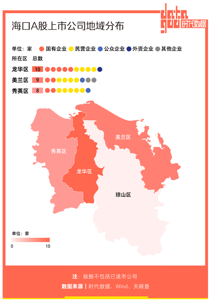 从上市公司地域分布来看,龙华区聚集的上市公司居多,达到10家;其中,国有企业5家、民营企业4家、外资企业1家。其后,美兰区以9家上市公司位居第二;秀英区以8家上市公司位居第三。