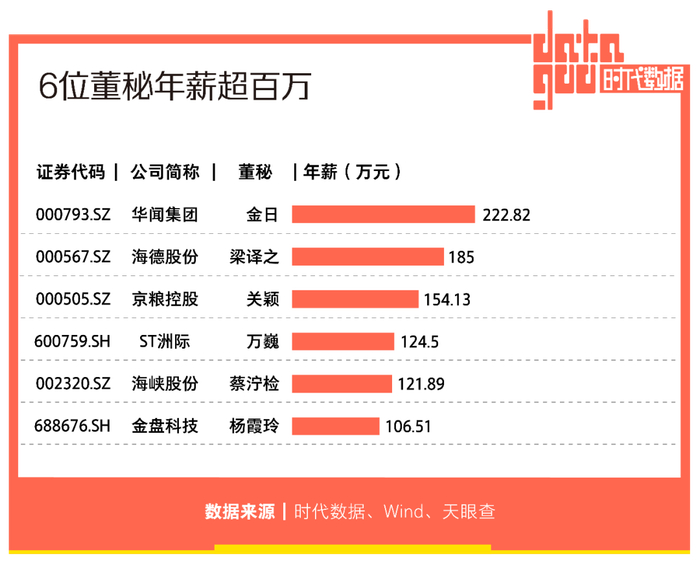 据时代数据统计,在这27家公司中,有6家公司的董秘2021年年薪超过100万元。其中,华闻集团(000793)董秘金日以222.82万元年薪位居第一;海德股份(000567)董秘梁译之以185万元年薪位居第二;京粮控股(000505)董秘关颖以154.13万元年薪位居第三。