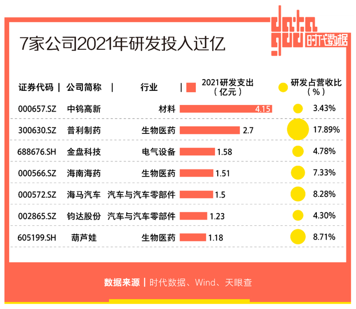 其中,中钨高新(000657)2021年研发投入位居第一,为4.15亿元,占全年营收的3.43%;其后,国内仿制药领域领先企业普利制药(300630)研发投入位居第二,为2.7亿元,占全年营收比高达17.89%。此外,全球领先的新能源电力系统配套提供商金盘科技(688676)以1.58亿元研发支出位居第三,研发占全年营收比为4.78%。