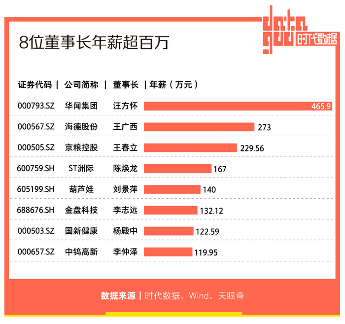 据时代数据统计,在这27家公司中,有8家公司的董事长2021年年薪超过100万元。其中,最高的是华闻集团(000793)董事长兼总经理汪方怀,年薪465.9万元;其次是海德股份(000567)董事长王广西,年薪273万元;京粮控股(000505)董事长王春立以229.56万元年薪位居第三。
