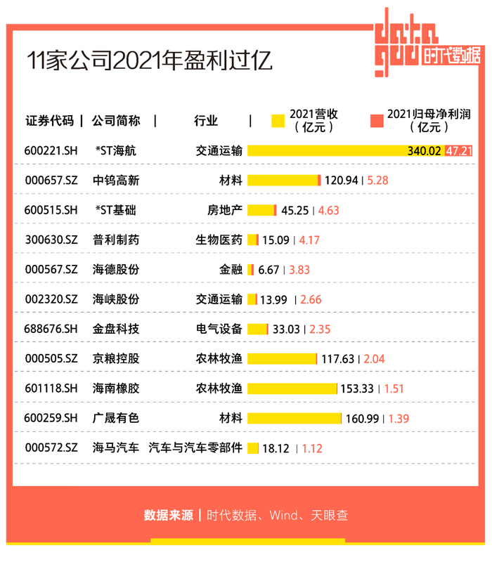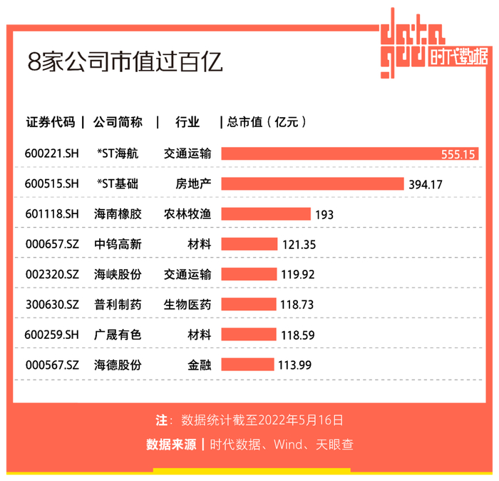 据时代数据统计,截至2022年5月16日,一共有8家公司市值超过100亿元。其中,*ST海航(600221)市值达到555.15亿元,排在第一;*ST基础(600515)市值394.17亿元,排在第二;海南橡胶(601118)市值193亿元,排在第三。