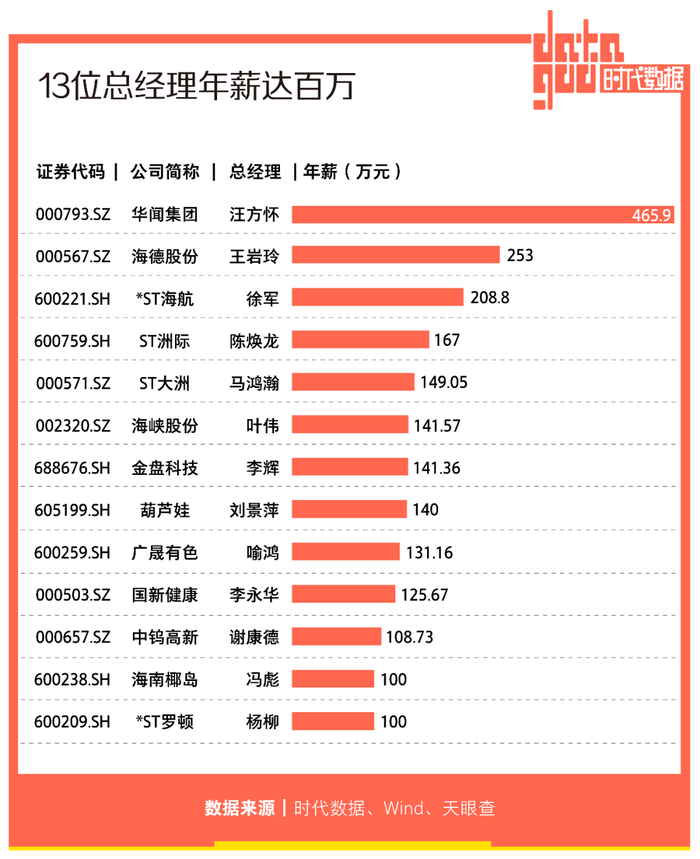 据时代数据统计,在这27家公司中,有13家公司的总经理2021年年薪达到100万元。其中,华闻集团(000793)董事长兼总经理汪方怀年薪居首;海德股份(000567)总经理王岩玲以253万元年薪紧随其后;其后,*ST海航(600221)总经理徐军以208.8万元年薪排在第三。