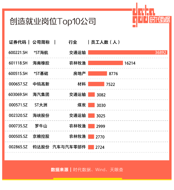 其中,国内领先的航空公司、刚刚完成破产重整的*ST海航(600221)创造的就业岗位居首,接近3.7万个。其后,国内天然橡胶行业领先企业海南橡胶(601118)拥有员工1.62万人,位居第二;最近完成债务重整的*ST基础(600515)拥有员工8776人,位居第三。