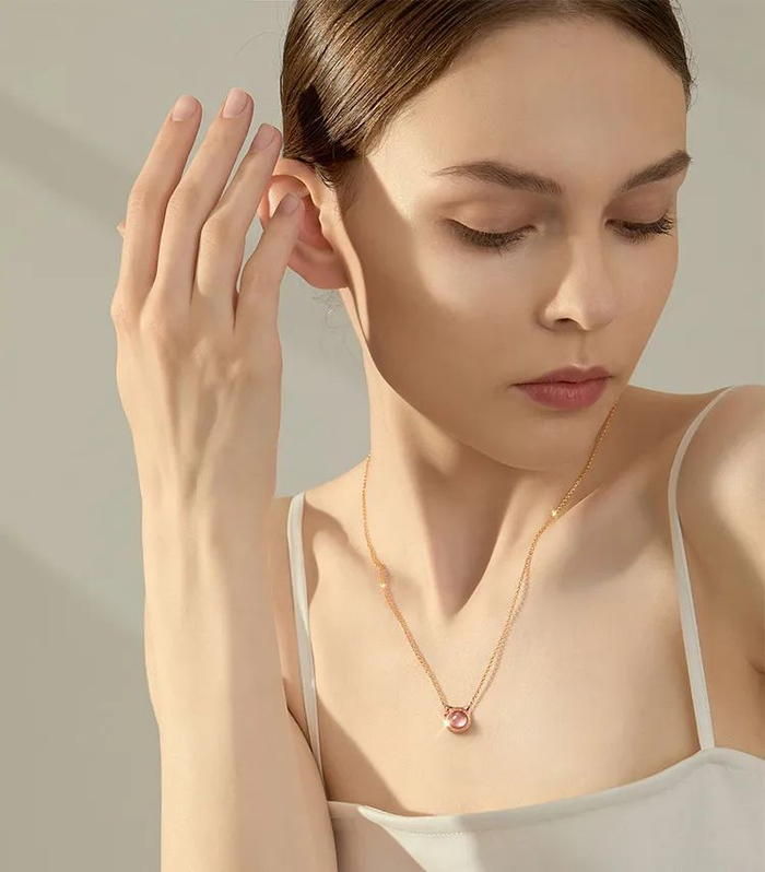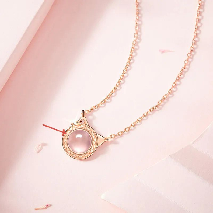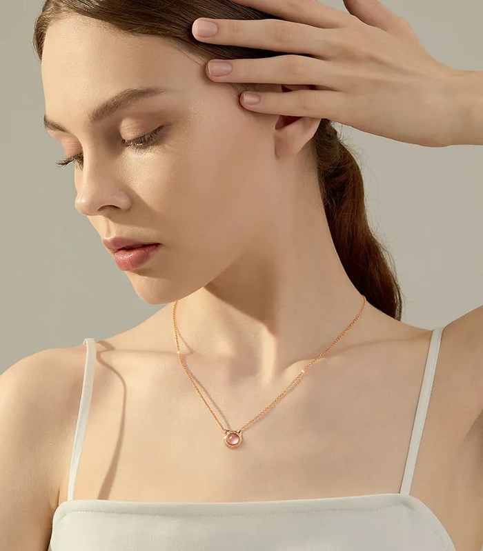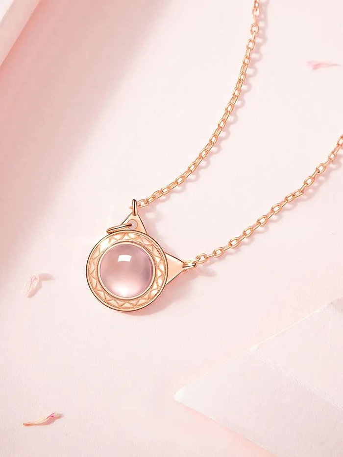 这款项链,甄选莹亮光洁的粉晶打造而成。
