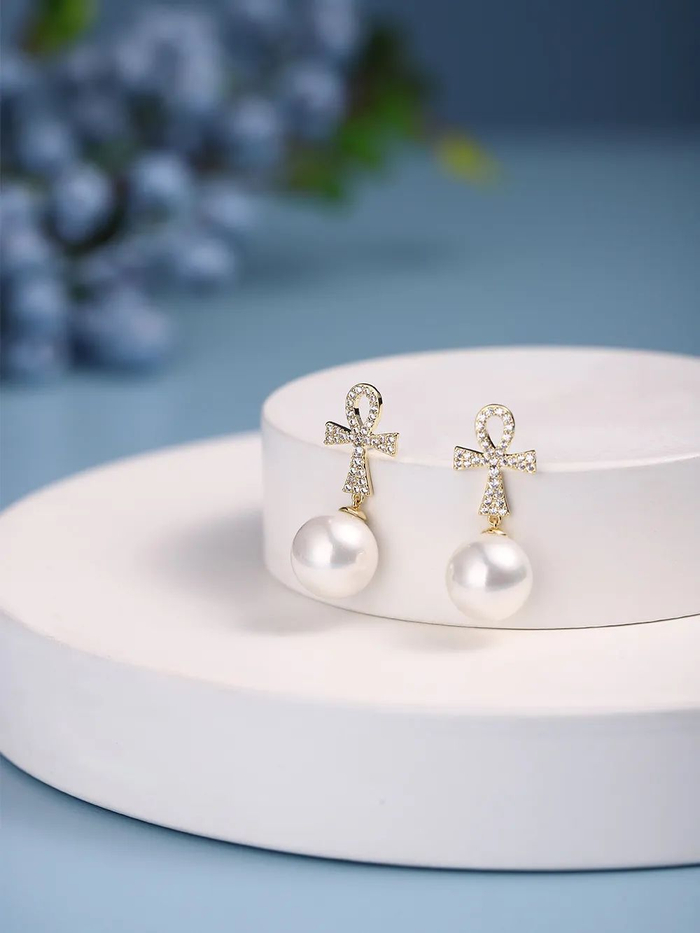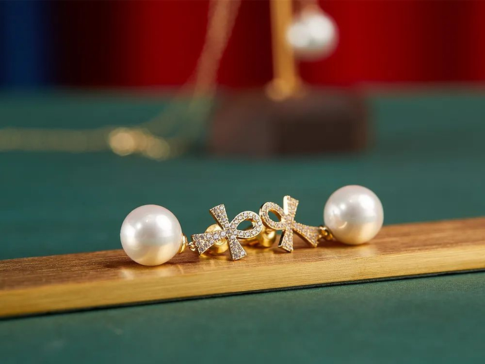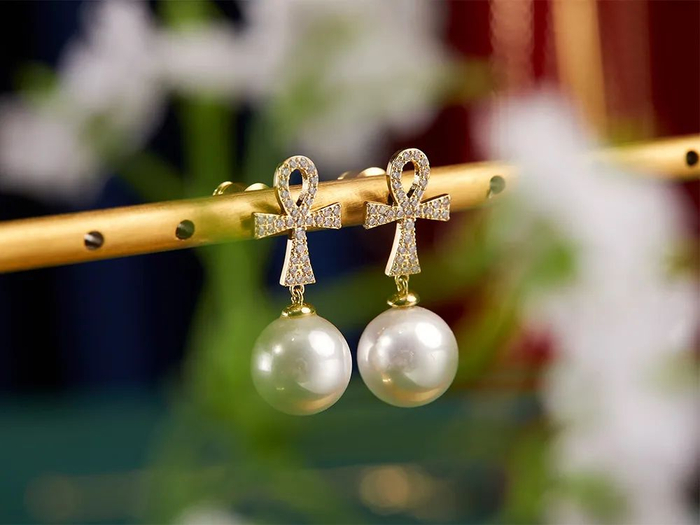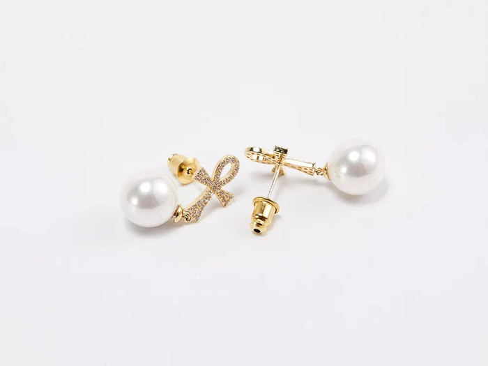 这款耳钉,同样是铜镀18K金安卡吊坠+贝壳珍珠的设计。