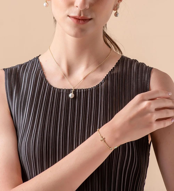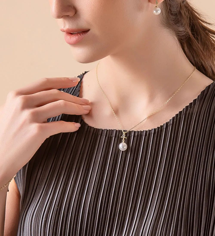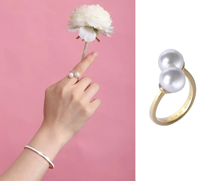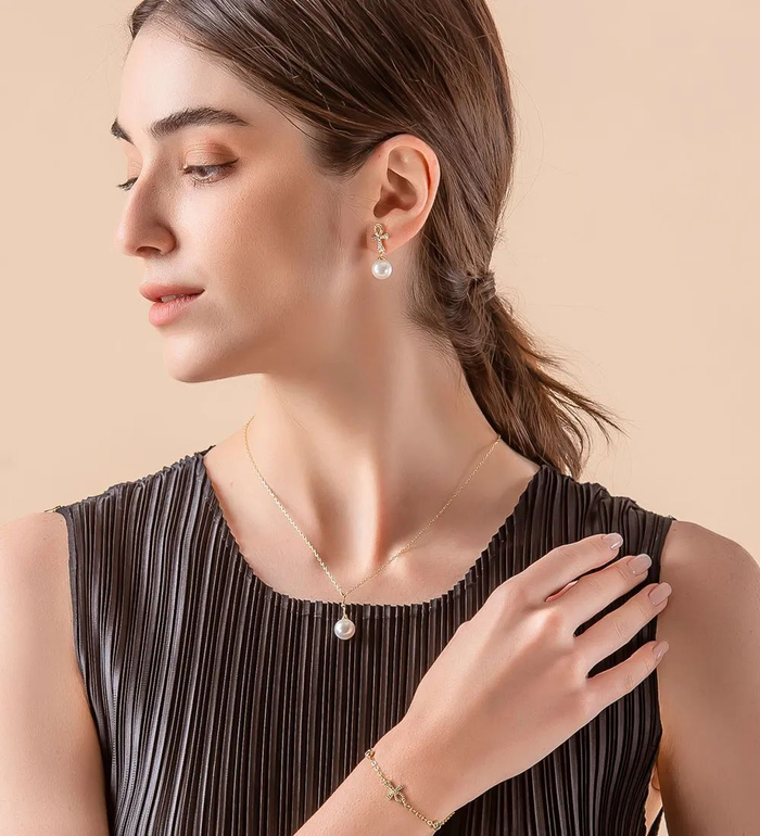 直径约10mm的贝壳珍珠,光泽细腻,与密镶的锆石相互映衬,华丽又优雅。