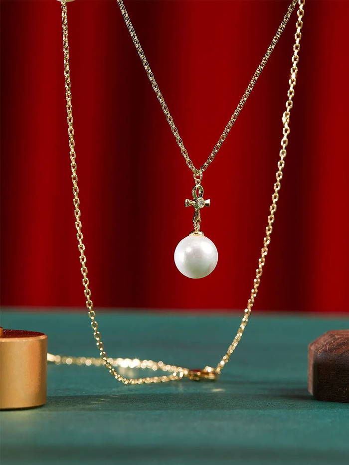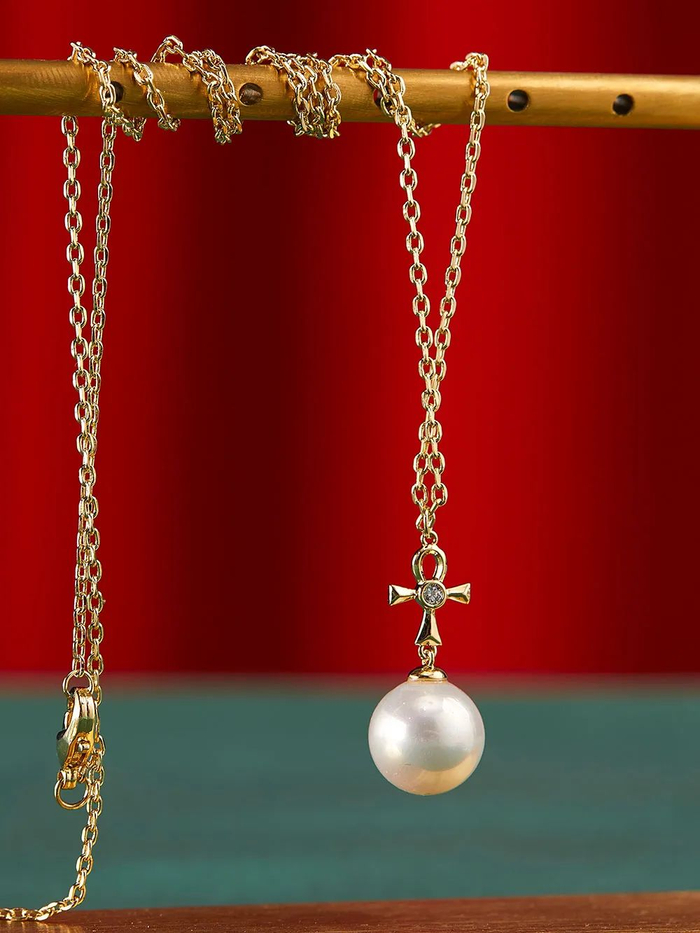 这款项链,由铜镀18K金安卡吊坠+贝壳珍珠组成。