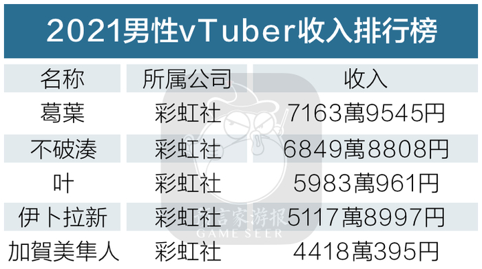 而眼下在全球范围内,男性虚拟主播都是不可忽视的一块细分市场。如果去看每年全世界vTuber巨头的收入数据,在这个女性为主的市场中,男性还是能够占据一席之地。2021年全球vTuber TOP30排行榜中,有5名是男性虚拟主播。葛葉和叶的成功已经为我们勾勒出了全球市场男性虚拟主播开始抬头的走势。