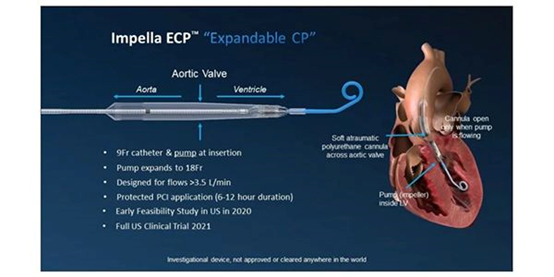 ②TandemHeart 是一种由体外离心泵供能的经皮左房-髂动脉旁路,可向动脉内提供3.5~4.0 L /min 的血流。TandemHeart增加了平均动脉压和全身血流量并显著提高心输出功率,降低了左心室压力、心脏做功及氧耗量。因此也主要应用于复杂PCI或心源性休克患者的治疗。