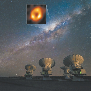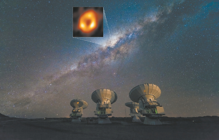 阿塔卡马大型毫米/亚毫米望远镜阵列(ALMA)正在观测夜空,图中标明了银河系中心超大质量黑洞的位置和它的照片。