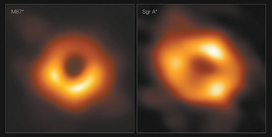 M87*(左)和人马座 A*(右)黑洞照片对比。