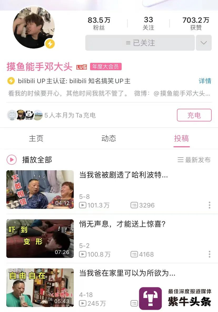 紫牛新闻记者在B站上看到,@摸鱼能手邓大头已经有83万粉丝,收获了700多万的点赞,从2019年上传视频开始,100多个视频记录了他的搞笑日常。记者翻阅了他的所有视频,从一开始记录自己和女朋友、朋友、同事之间的故事,到慢慢把镜头对准了爸爸妈妈和姥爷,随之记录下一家人相处的有趣片段。这些视频播放量从几万到几百万不等,最高的单条播放量接近900万。