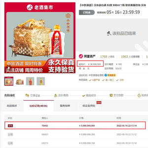 5月16日,一瓶“汉帝茅台酒”,在阿里拍卖平台上被拍出99.999999亿元的惊人价格,引发市场关注。最终,因有用户涉嫌恶意竞拍,致拍卖价格远超估值,商家紧急中止本场拍卖。