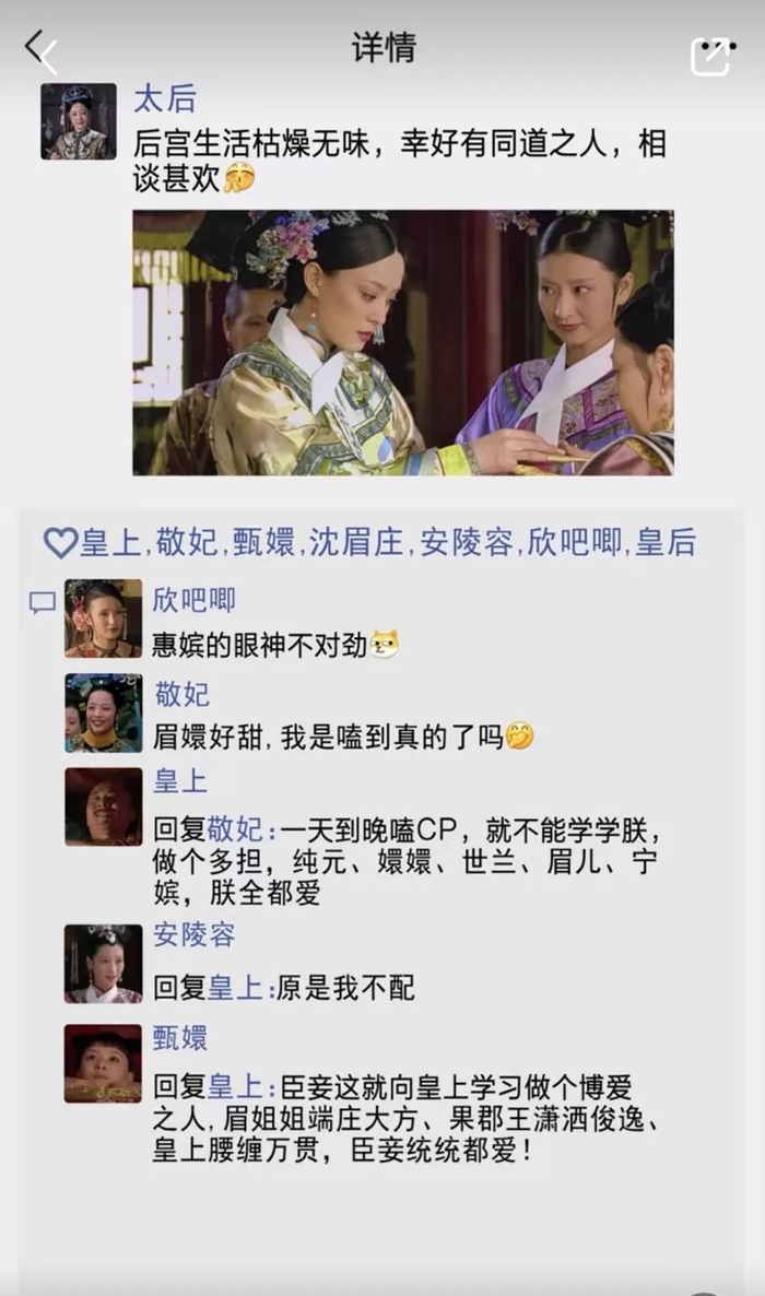 我给叔叔讲了S同学的“中译中”系列,他表示自己虽然不会关注《甄嬛传》的二创,但是也比较认可这样的创作形式。