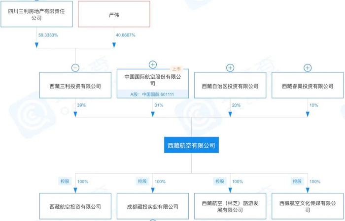 穿透股权可知,西藏航空由西藏三利投资、西藏睿翼投资、中国国航、西藏自治区投资四大股东,分别持有39%、10%、31%、20%股权。前两者的实控人,均是以严伟为代表的“严氏家族”。