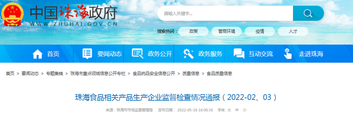 中国质量新闻网讯 近日,珠海市市场监督管理局发布珠海食品相关产品生产企业监督检查情况通报(2022-02、03)。