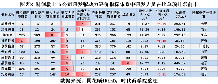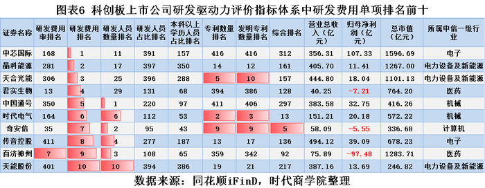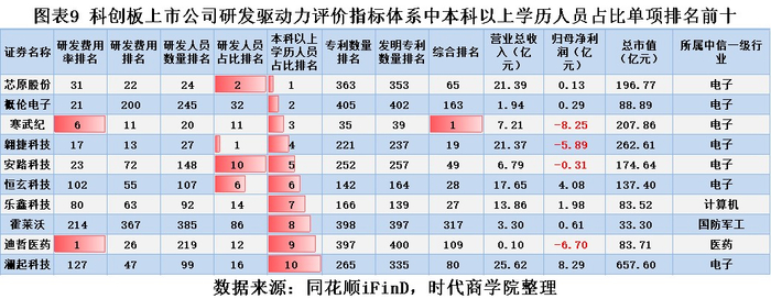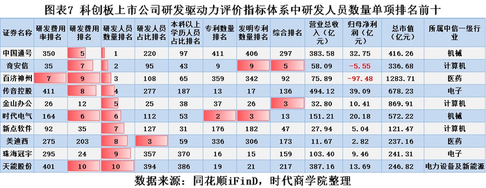 时代商学院在上述三大维度基础上,构建起企业研发投入金额、研发投入占比、专利数量、发明专利数量、研发人员数量、研发人员数量占比、本科生及研究生数量总占比这7大观察指标,并以此进行排名统计,制作科创板研发驱动力排行榜。