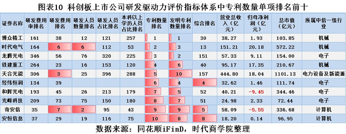 从技术储备实力看,上述10家企业的专利总数平均值、发明专利数量平均值分别约为43个、30个,这两个单项指标的排名均值分别约为340、342,在科创板上市企业中处于尾部区间。
