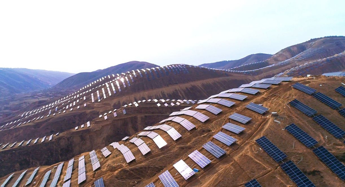 永靖县新寺乡崖头村地处青藏高原和黄土高原的过渡地带,沟壑纵横,交通不便,制约着该地区的经济发展。然而,海拔较高的地理环境也让该地区拥有了得天独厚的光照资源。在这样的环境下,发挥地理优势,光伏发电成为带动农民增收和助力地方经济发展的最好选择。一排排单晶硅太阳能电池板整齐排列,昔日沉睡的荒山,如今披上了湛蓝色的光伏“新衣”。
