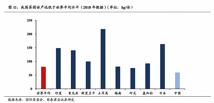 第一,在生产端,我国茶种的产地分布广泛,且茶叶产量领先全球,但从茶园单产角度来看,供给效率仍然不高。