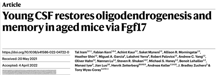 研究团队总结道,这些发现表明年轻的脑脊液具有“返老还童”的能力,并确定Fgf17是在衰老的大脑中恢复少突胶质细胞功能的关键靶点。