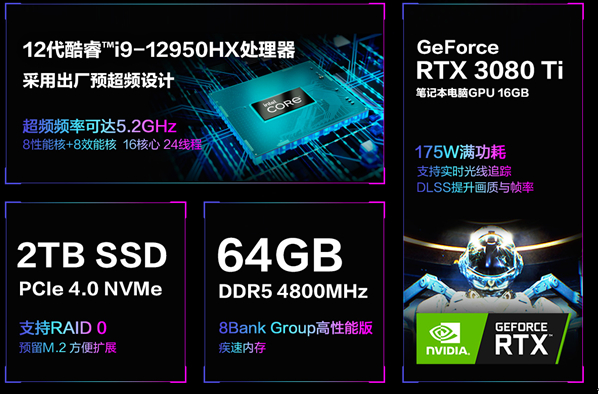 核心卖点:最强游戏本性能实力:英特尔第12代酷睿i9-12950HX处理器+175W NVIDIA GeForce RTX3080Ti笔记本电脑GPU,支持“双显三模”显卡切换,双烤功耗达65W+175W(手动模式下)顶级散热系统:冰川散热架构2.0增强版,双新一代暴力熊定制液金+真空腔均热板赛事级电竞屏:17.3英寸赛事级电竞屏,2.5K分辨率,240Hz高刷率,3ms疾速响应,支持杜比视界、Adaptive Sync防撕裂技术超越想象外观探索:A面隐形油墨涂装,沉浸神光同步,可替换信仰徽章