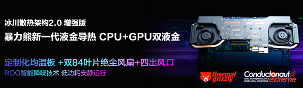 为充分释放产品性能, ROG枪神6 Plus超竞版搭载冰川散热架构2.0增强版,处理器与显卡均覆盖ROG与暴力熊合作定制的新一代液态金属导热介质,85.4W/mK高导热率能够更好传导核心芯片热量,配合能够更大覆盖主要发热部件的真空腔均热板,实测下,相比传统热管散热模组,核心发热部件温度至高降低约15°,让游戏性能保持持久稳定。赛事级电竞屏最强性能眼见为实