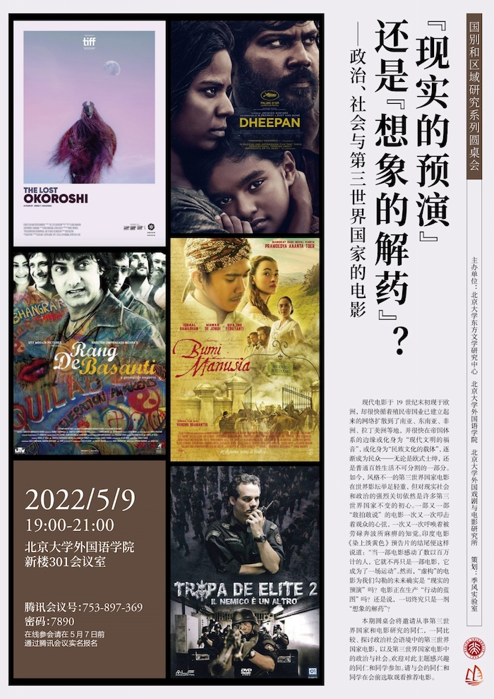 本文整理自2022年5月9日由北京大学东方文学研究中心、北京大学外国语学院、北京大学外国戏剧与电影研究所共同主办的主题为“‘现实的预演’还是‘想象的解药’?——政治、社会与第三世界国家的电影”的国别和区域研究圆桌会。发言人分别为北京大学外国语学院法语系副教授朱晓洁、亚非系助理教授程莹、西葡意语系助理教授樊星、东南亚系助理教授谢侃侃、国别和区域研究专业助理教授张忞煜,点评人为东南亚系教授吴杰伟和法语系副教授罗湉。