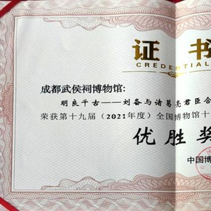 成都武侯祠博物馆推出的历史文化名人特展“明良千古——刘备与诸葛亮君臣合展”在全国157个参评展览中,荣获“全国博物馆十大陈列展览精品推介优胜奖”。