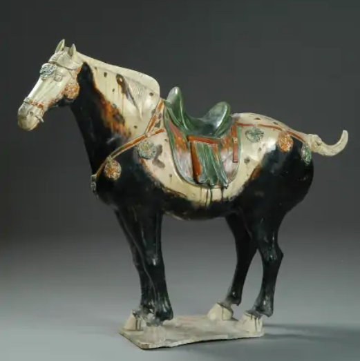 洛阳博物馆珍藏的这件唐三彩黑釉马,高73、长84厘米,四足挺立,头颈上昂,眼视前方。全身黑色,唯马面、鬃、背、尾、蹄为白色,间施酱黄色花斑,马鞍鞯为绿、黄、白三色相间,背垫褐色釉的革带为饰,革带系绿色或棕色的圆形骑马浮雕垂饰15枚。在唐三彩中实属罕见,是文献中“龙种神驹,四蹄踏雪”的艺术再现。并且,唐三彩黑釉马膘肥雄浑,造型雄健有力,鞍鞯俱全,体态雄健,气势雄伟,色泽质感及姿势神态均取得了力与美的和谐统一,华丽的装饰与黑色相配更加显得醒目明快,处处都透出一种内在的、真实的美。