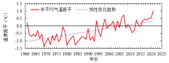 ▲ 1961-2021 年安徽省年平均气温距平变化