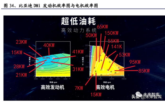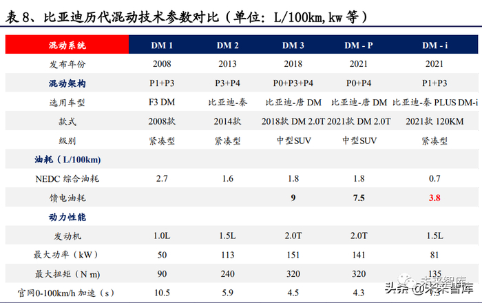 比亚迪:长期深耕混动技术,DM 系统产品不断迭代,比亚迪 DM 系统率先开 始布局混动市场。比亚迪是国内自主品牌中最先布局混合动力技术研发的主 机厂,于 2008 年推出首款以经济性为导向的混合动力系统 DM1,实现了 2.7L/100km 的综合工况油耗。2009 至 2020 年相继推出以动力性为导向的 DM2、 DM3 混合动力系统,逐步布局新能源混动市场。历经三代产品迭代,DM-P、 DM-i 双平台颠覆混动市场。2021 年比亚迪重磅发布 DM-P、DM-i 双平台。DM-P 延续了 DM3 的动力性能,以 P0+P4 双电机四驱架构,通过在后桥加装 BSG 电 机,既可以作为发动机,又可以作为动力的辅助电机,着力提高了发动机功 率从而为混动车型提供强劲动力。DM-i 延续了 DM1 的经济性能,采用了双电 机 P1+P3 的混联架构,通过新一代 EHS 电机,实现多用电、少用油的“以电 机驱动为主,发动机为辅”的经济型架构,即使在馈电状态下依然保持超低 的油耗。