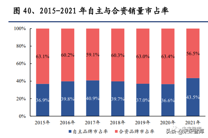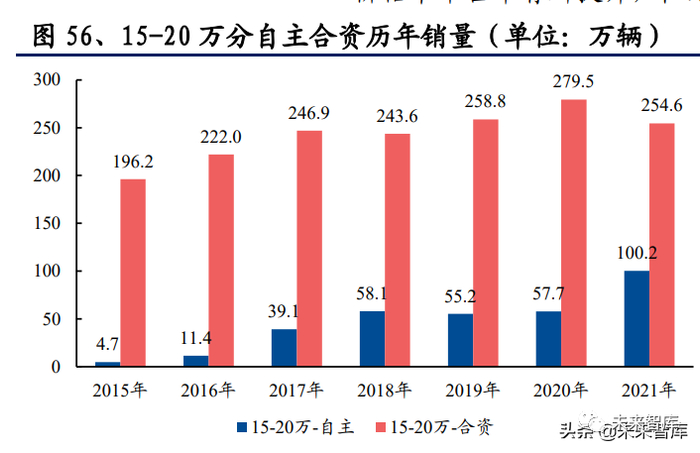 15 万及以下市场自主品牌已站稳根基,15 万及以上市场自主品牌亟需突破。10 万以下自主品牌市占率显著高于合资品牌,10-15 万价格带当前自主与合资品牌 市占率基本相当,10 万及以下,10-15 万目前是自主品牌主要盘踞的市场价格带 区间。但在 15-20 万,20 万及以上价格区间,自主品牌由于过往品牌、产品力方 面与合资品牌存在差异,其市场基础与产品布局在此价格带相对薄弱,2021 年自 主品牌在 15-20 万/20 万及以上价格带销量占比分别为 4.8%/3.3%,2021 年合资 品牌在 15-20 万/20 万及以上价格带销量占比分别为 12.1%/23.3%,自主品牌在 15 万及以上价格带相较合资品牌仍有一定差距,是目前自主品牌亟需突破的产品价 格带。