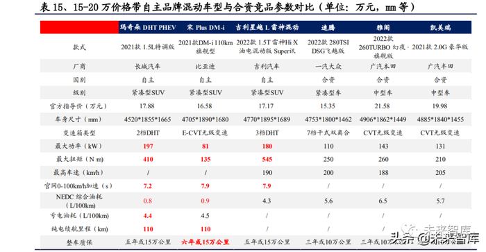 2021 年自主品牌开始发力布局 15-20 万混动市场,多款重磅车型后续上市,市场 份额有望迎来提升。2017-2018 年由于新能源补贴驱动,自主插电混动车型主要 聚焦 15-20 万市场;2019 年后补贴明显退坡,自主品牌混动销量占比有所回落。2021 年开始以比亚迪、长城汽车为代表的自主品牌伴随全新混动平台发布,多款 混动车型开始布局,快速切入混动市场。自主混动销量进入快速放量期,2021 年 自主品牌 15-20 万价格带混动车型销量 11 万辆,占 2021 年 15-20 万混动市场 44.4%,该价格带混动市场市占率同比显著提升。伴随新一代自主混动技术崛起, 自主混动车型产品力相较合资竞品车型已具备竞争能力,凭借价格与配置优势, 销量提升有望带动自主品牌在 15-20 万价格带市占率进一步提升。(报告来源:未来智库)