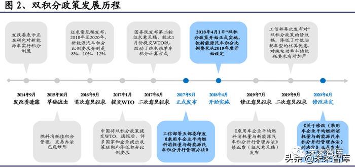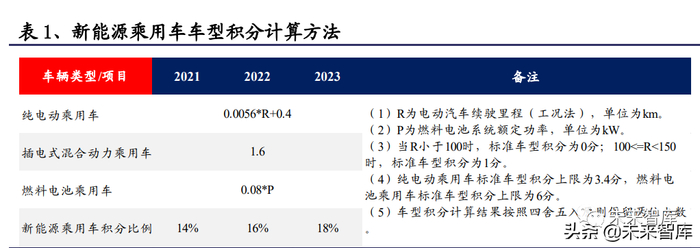 “双积分”政策是推动乘用车节能技术发展的重要动力,不达标车企高油耗车型 生产将受到限制。《乘用车企业平均燃料消耗量与新能源汽车积分并行管理办法》, 简称“双积分”政策,最早于 2017 年 9 月由国务院发布(于 2018 年 4 月 1 日实 施),2020 年 6 月 22 日第二次修订(于 2021 年 1 月 1 日实施)。“双积分”政策 一方面通过约束 NEV 积分为正且持续提升积分比例,推动 EV+PHEV 新能源车在乘 用车企业产量占比中获得持续提升(虽然政策只约束产量,但若卖不出去还是会 持续亏损),另一方面通过 CAFC 积分约束,推动 ICE+HEV 传统燃油车型节油能力 持续提升。若不能满足“双积分”政策的考核要求,NEV 与 CAFC 负积分无法抵偿 清零,则将会限制尚未达到燃油消耗量目标值的传统燃油车生产,对企业短中期 市场拓展形成压力,企业完成“双积分”任务的考核是长期扩大产销规模的条件。