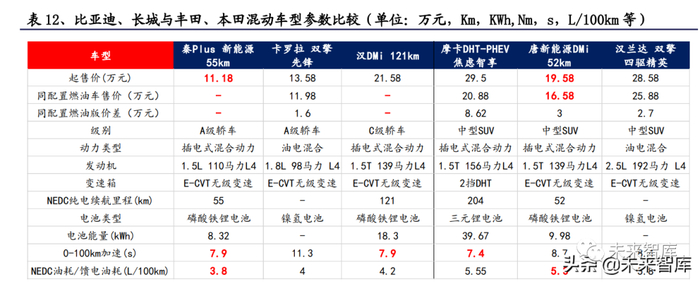 比亚迪 DMi、长城柠檬混动 DHT、吉利雷神混动相较日系混动已具备竞争优势。根据前述混动系统性能核心评价指标,结合混动系统与对应燃油版本差价(混动 系统增加成本)来看,当前比亚迪 DMi、长城柠檬 DHT、吉利雷神混动的综合性能 已与日系本田、丰田混动能力相当, 在发动机、电机、整车动力性能、油耗等指 标上已与丰田、本田不相上下,在 PHEV 领域相比日系成本控制更好。
