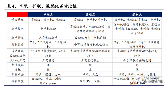 根据发动机与驱动电机的动力传动关系不同,混动系统可分为串联(只有电 动机输出,发动机为电动机发电,举例理想 ONE 等)、并联(发动机与发电机 共同输出,举例本田 i-MA 等)、混联(串联+并联)三种模式(丰田 THS、本 田 i-MMD、比亚迪 DMi、长城柠檬 DHT 等)。