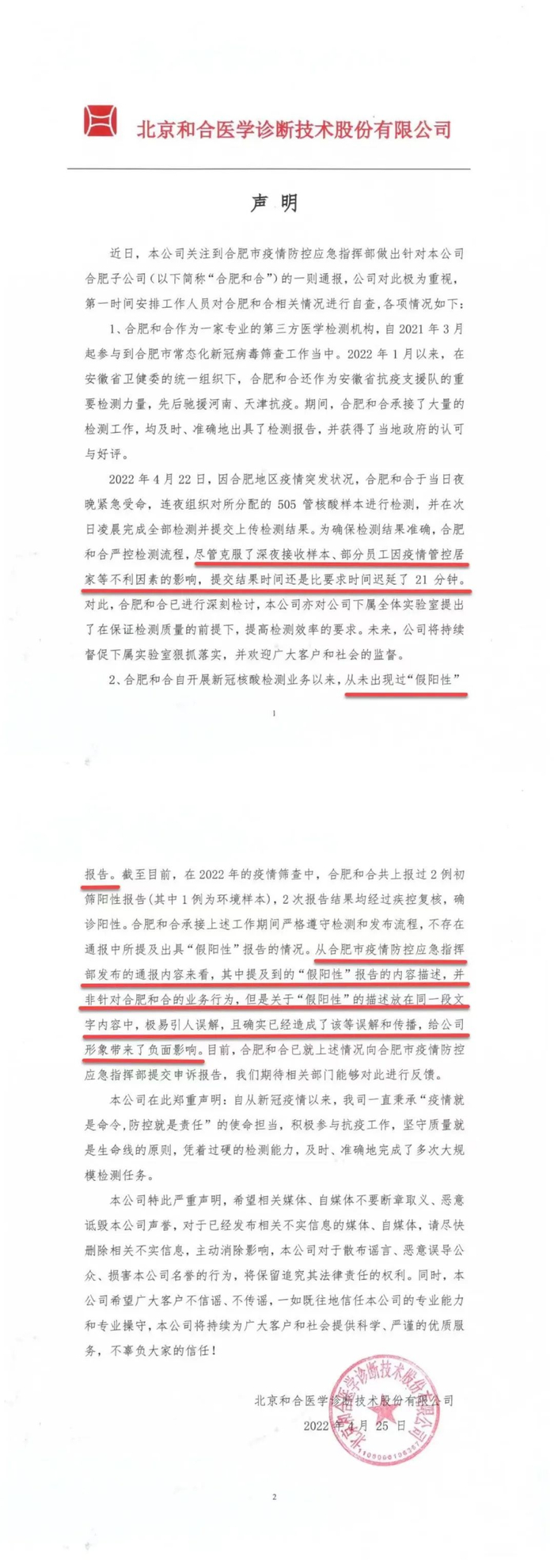第二,声称“从未出现过假阳性报告”,并剑指政府公告中“出具‘假阳性’报告的内容描述,并非针对合肥和合的业务行为,放在同一段文字中极易引人误解,给公司形象带来了负面影响。”