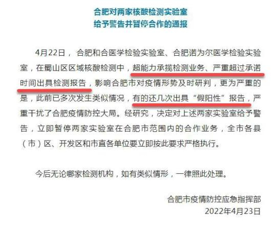 2022年4月23日,合肥市疫情防控应急指挥部发布通报,对合肥和合医学检验实验室、合肥诺为尔医学检验实验室两家核酸检测实验室给予警告并暂停合作。