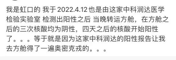 据凤凰网,多位上海市民在中科润达进行的单人单管核酸检测呈“阳性”后,其后的检测始终为阴性。更有甚者,有网友怀疑,自己因中科润达的“阳性”报告被转至方舱医院后,连续三次检测阴性后转阳,“等于就是因为这家中科润达的阳性报告让我去方舱得了一遍奥密克戎的”。