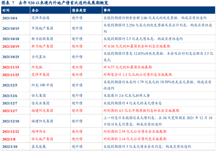 在去年930之后,境内外地产债违约或展期频繁出现。其中有16家房企境外债发行主体未能到期偿付本息或履行担保义务,构成实质违约;9家房企境内债出现展期,分别为新力地产、阳光城、花样年集团、福建阳光集团、鸿坤伟业、恒大地产、龙光控股、融创集团、富力地产。