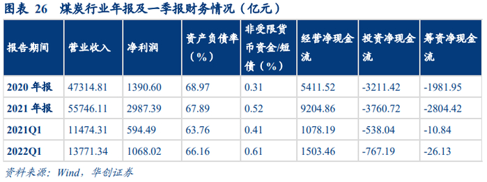 资本结构方面,煤炭企业资产负债率稳中有降。煤企在现金流充沛的情况下,偿还负债降杆杆效果明显,2021年资产负债率同比下降了1.11%,2022Q1资产负债率同比上升了3.76%,但整体仍低于2020年水平。