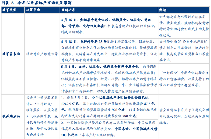 在政策基本面方面,释放了房地产维稳信号。在金融委会议之后,银保监会、证监会、财政部等六大部委积极表态以提振房地产行业信心,稳定市场预期。央行外管局23条出台明确支持房地产开发企业、建筑企业合理融资需求,促进房地产市场平稳健康发展。“一行两会”专题会议均提到支持房企债券融资,监管支持下房企融资情况有望改善。预计后续在发债、债务处置、鼓励机构投资者持股等具体方面会出台更多支持性政策。