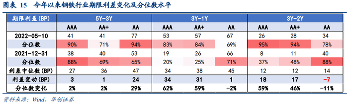 1、拉久期配置:钢铁债目前短期品种挖掘价值不大,建议久期适度拉长至2-3年,可关注河钢集团、沙钢集团、山钢集团等信用资质相对较好且存在一定收益的钢企。2022年初以来,1年期各等级钢铁债信用利差收窄13BP-26BP,当前利差分位数已降至历史的5%以内的较低水平,配置性价比较低,3年期中债隐含评级AAA、AA+、AA钢铁债仍存在一定的利差挖掘机会,值得关注。