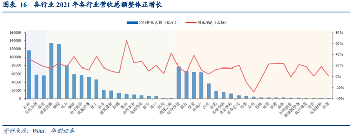 2021年多数行业实现营收正增长,中上游整体优于下游行业。按行业来看,共有37个行业营收同比增速为正,4个行业增速为负。增速为正的行业中,上游行业有色金属、石油、煤炭均有高速增长;中游行业航运、高速公路、化工、钢铁、仓储物流和城投同比涨幅较大;下游行业贸易、旅游、新能源设备、造纸等行业增速均超过20%。增速为负的行业主要集中在下游,包括传媒、纺织服装、家电和零售。