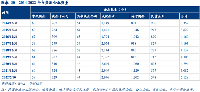 从企业数量层面看,今年以来城投企业、中央国企、央企子公司、其余央企公司数量变化不大,地方国企数量增长明显,民营企业数量继续下降。截至2021年5月10日,我国信用债市场发债企业合计5128家,较2021年末增加了46家企业,其中地方国企增加73家,民营企业下降29家,其余类别企业数量变化不大。