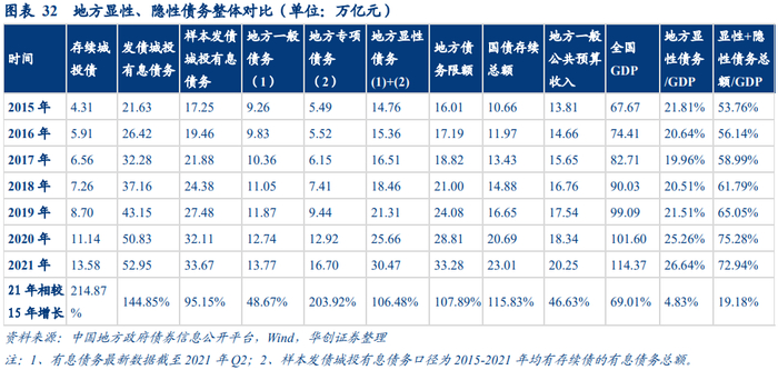 1、从2015-2021年的增幅比较来看,地方债务增长大于代表中央的国债增幅,债务增幅整体大于GDP增幅。存续城投债增幅214.87%>发债口径城投有息债务增幅144.85%>国债增幅115.83%>地方政府显性债务增幅106.48%>全国GDP增幅69.01%。近年来虽然开前门、堵后门的政策力度不减,但从实效来看,按照市场相对公允的城投认定口径,我们可以发现目前隐性债务增速,尤其是城投债增速,仍是各类债务中增速最快的。