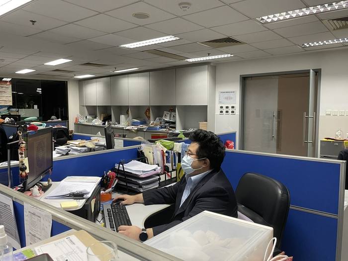 罗佳明在他组长的办公室房间里打了个地铺,每天8点钟起床,测完一次抗原,再去参加8点半的晨会,随着9点半开盘,罗佳明就投身到市场之中,直到港股下午4点收盘。休市以后,迎接他的还有各种会议、路演、上市公司的线上调研等,一般凌晨1点才会睡觉。